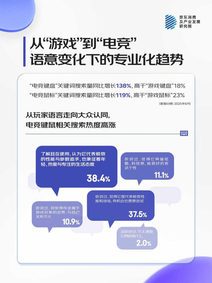 这一语言上的迁移,同样体现在消费者的实际行为中。从京东25年6月的数据表现上, “电竞键盘”与“电竞鼠标”的搜索量同比增幅(138% / 119%) ,远超传统的“游戏”关键词增速(18% / 23%)。越来越多的消费者主动在搜索框中输入“电竞”,不只是为了找到一款能用的设备,而是为了找到一套能让自己“像玩家一样使用”的装备。这场从语义到行为的变化,正在重塑整个外设市场的叙事方式。