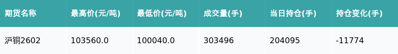 南财智讯1月8日电,南财金融终端盘后期货数据显示,上海期货交易所的沪铜主力合约收跌2.76%,收盘报101220.0元/吨,日内资金流出16.65亿元。其他相关指标见下表: